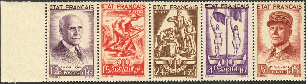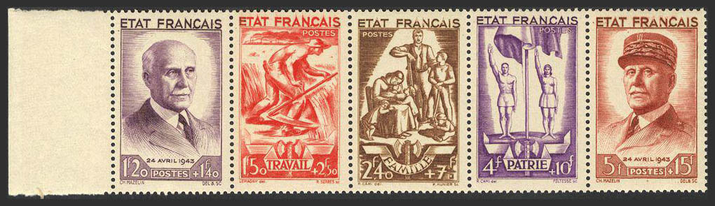 ★Yvert 580A. 1943. Serie completa, banda de cinco. MAGNIFICA. Yvert 2014: 155 Euros