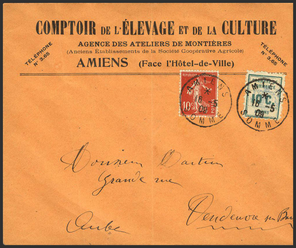 Yvert 1. 1909. 10 cts rojo y 10 cts verde, sello de Greve. AMIENS a VENDEUVRE (FRANCIA). Matasello AMIENS/ SOMME. MAGNIFICA Y RARA.