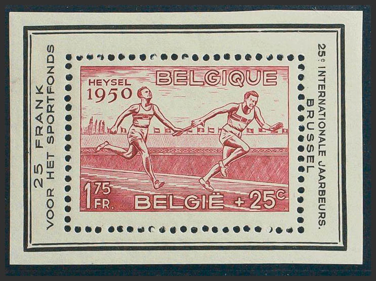 ★★1950. 1´75 fr + 25 cts rojo (emisión privada). Hoja bloque con leyenda 25 INTERNATIONALE JAARBEURS BRUSSEL, en negro. MAGNIFICA.