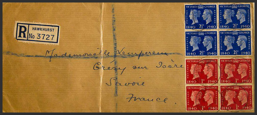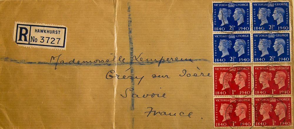 Yvert 228(4), 231(4). 1940. 1 p rojo, bloque de cuatro y 2 1/2 p ultramar, bloque de cuatro. Certificado de HAWKHURST a GRESY SUR ISERE (FRANCIA). Al dorso llegada. MAGNIFICA.