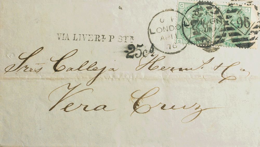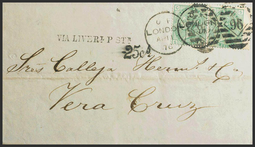 Yvert 53(2). 1876. 1 sh verde Plancha 12, pareja. LONDRES a VERACRUZ (MEJICO). En el frente marca VIH LIVER. P. STR y tasada a la llegada con 25 cts. MAGNIFICA.