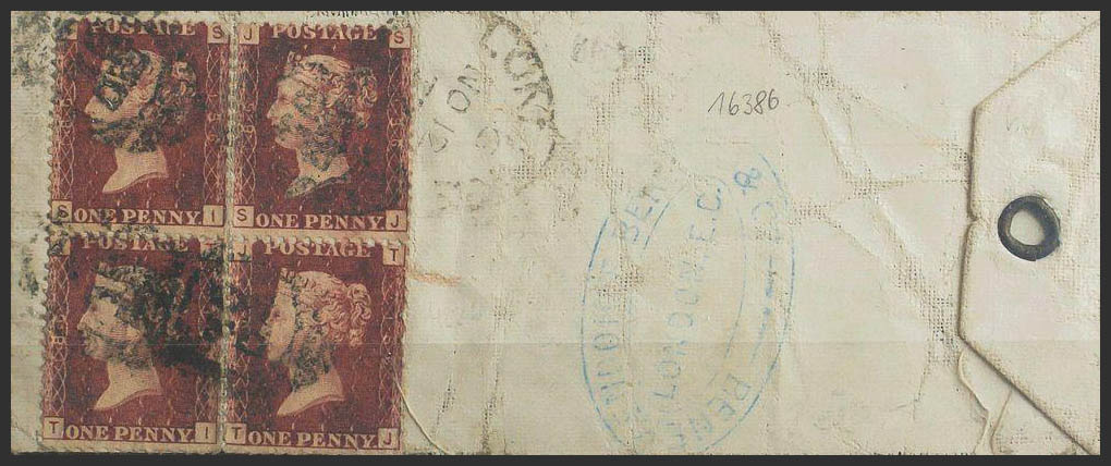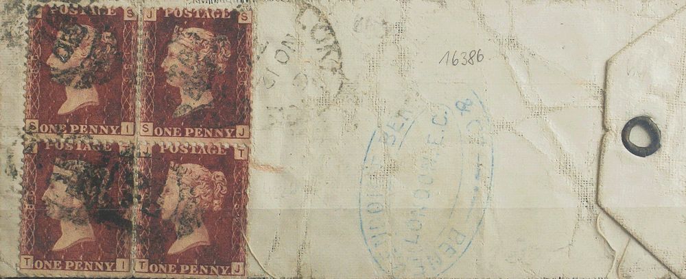 Yvert 26(4). 1872. 1 p rojo carmín Plancha 186, cuatro sellos. Etiqueta Postal de LONDRES a FREIBERG (ALEMANIA). MAGNIFICA Y RARA.