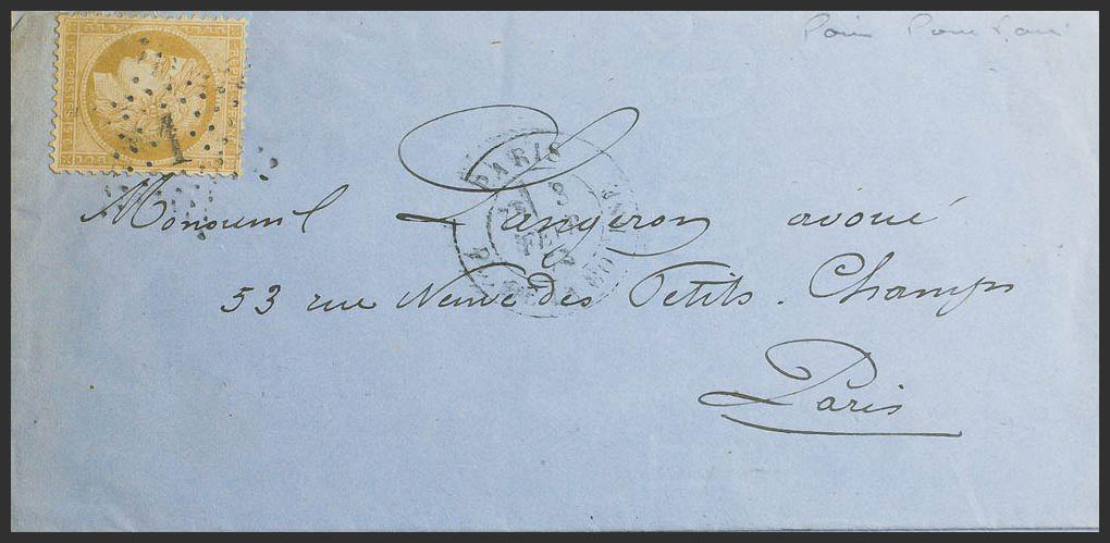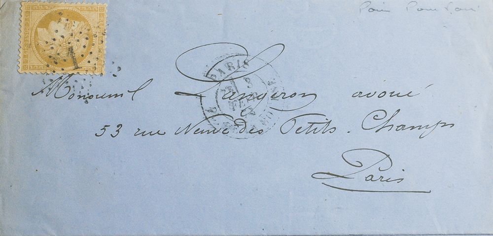 Yvert 59. 1873. 15 cts castaño amarillo. Correo Interior de PARIS. Matasello ESTRELLA DE PUNTOS Nº1. MAGNIFICA.