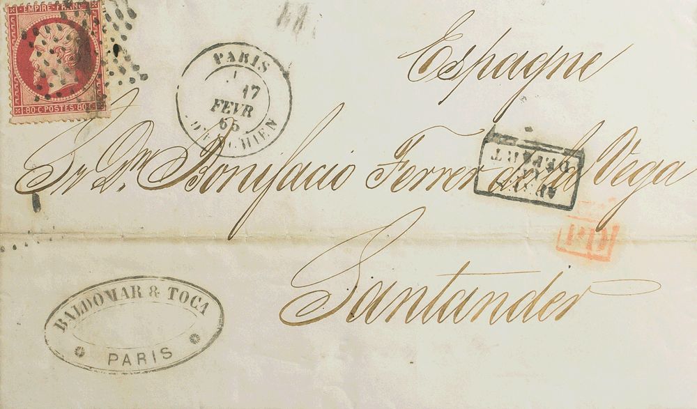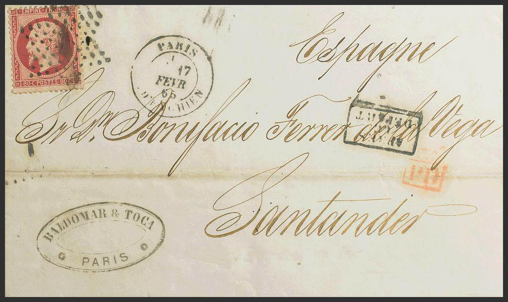 Yvert 24. 1865. 80 cts rosa. PARIS a SANTANDER. Matasello ESTRELLA DE PUNTOS Nº1, en el frente marca APRES / LE / DEPART. MAGNIFICA.