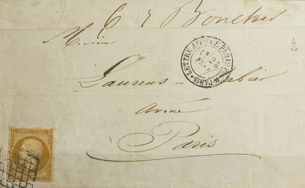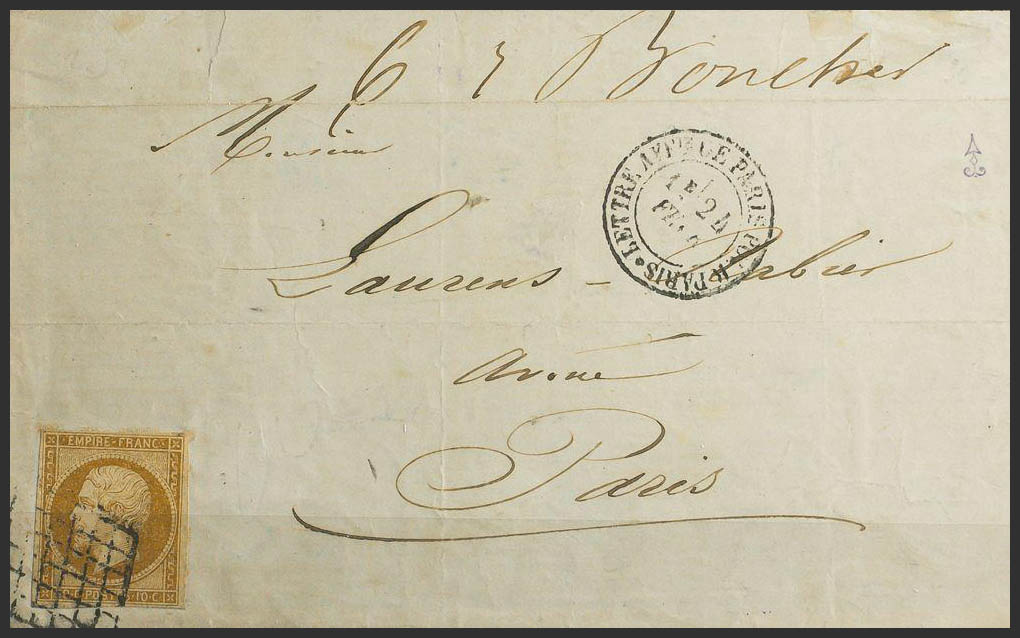 Yvert 13A. (1853ca). 10 cts castaño amarillo. Frontal de Correo Interior de PARIS. Matasello REJILLA, en el frente fechador LETTRE AFFE DE PARIS POUR PARIS. MAGNIFICA Y RARA.