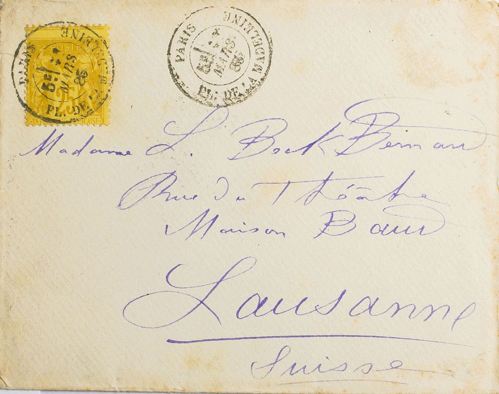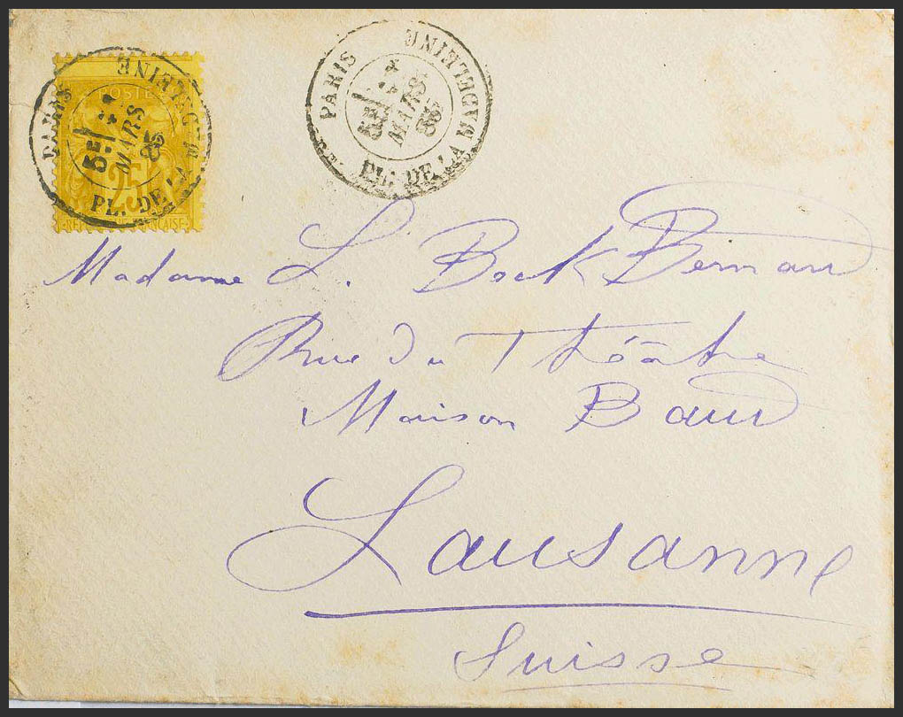 Yvert 92. 1885. 25 cts castaño sobre amarillo DENTADO DESPLAZADO. PARIS a LAUSANNE (SUIZA). Matasello PARIS / PL. DE LA MADELEINE. MAGNIFICA.
