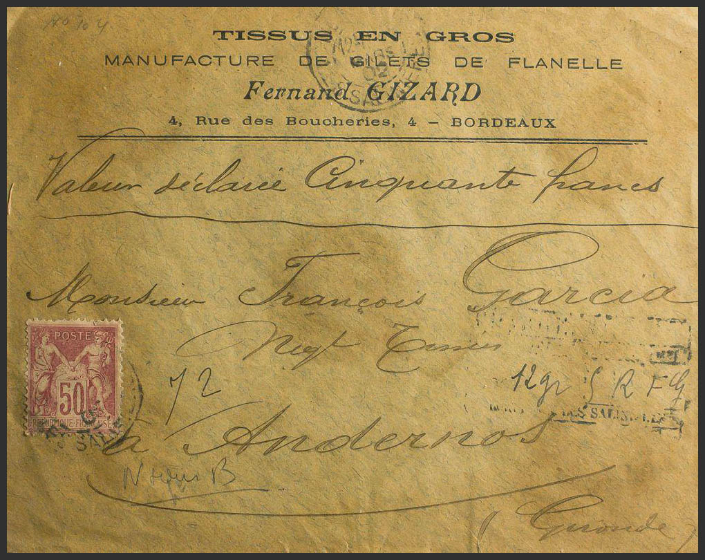 Yvert 98. 1902. 50 cts rosa. Certificado de BURDEOS a ANDERNOS LES BAINS. Matasello BORDEAUX / LES SALINIERES, al dorso llegada. MAGNIFICA.