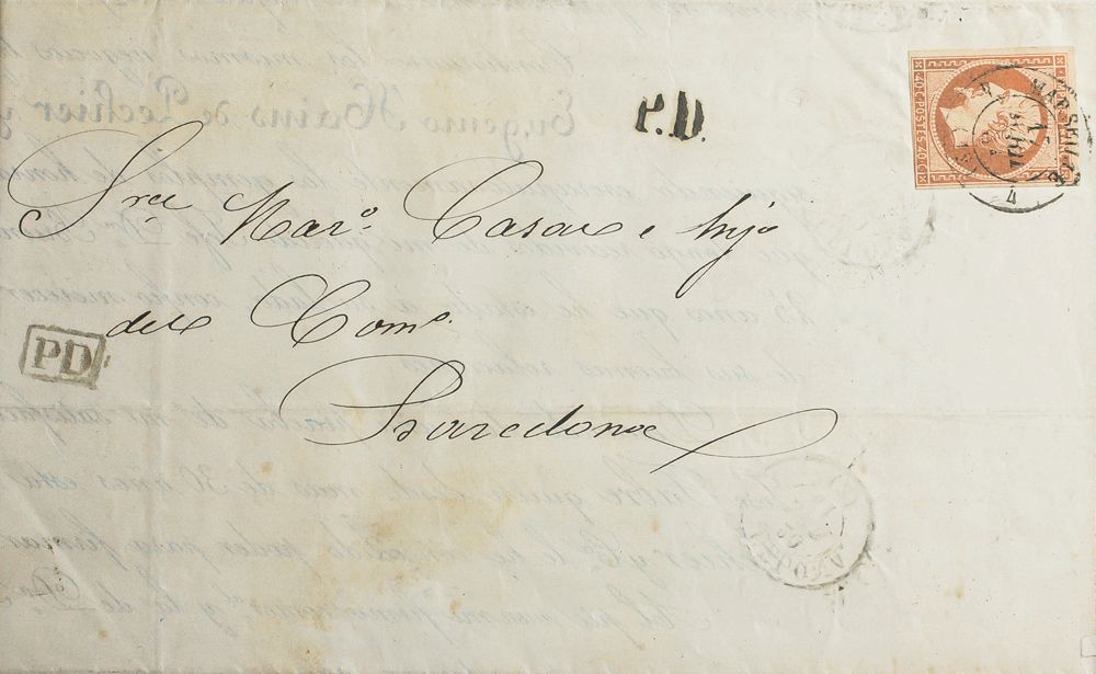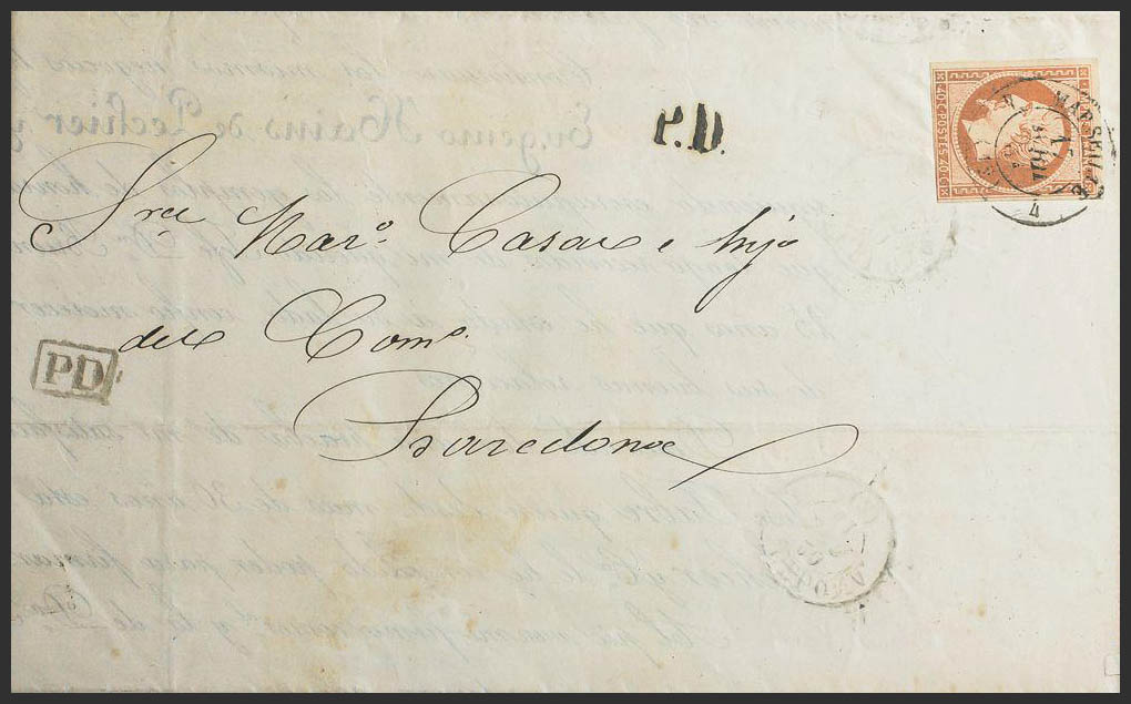 Yvert 16. 1861. 40 cts naranja. MARSELLA a BARCELONA (ESPAÑA). Matasello MARSEILLE / (12). MAGNIFICA.