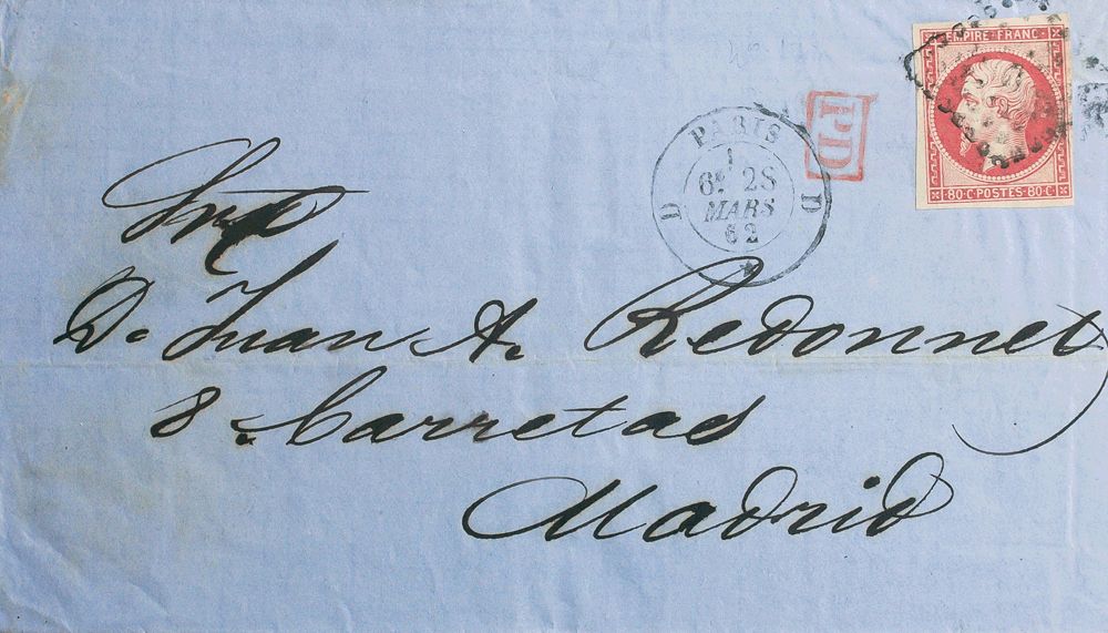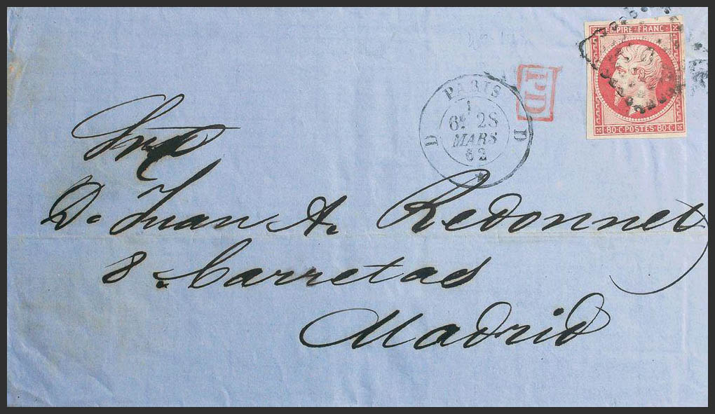 Yvert 17B. 1862. 80 cts rosa. PARIS a MADRID (ESPAÑA). Matasello ROMBO DE PUNTOS. MAGNIFICA.