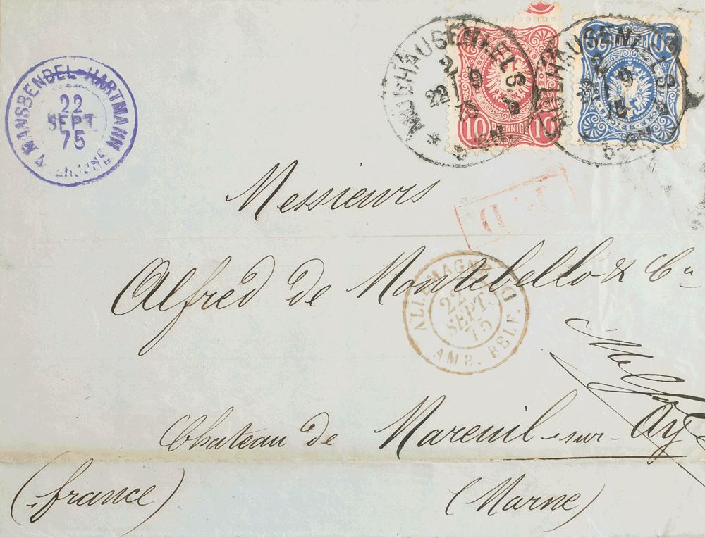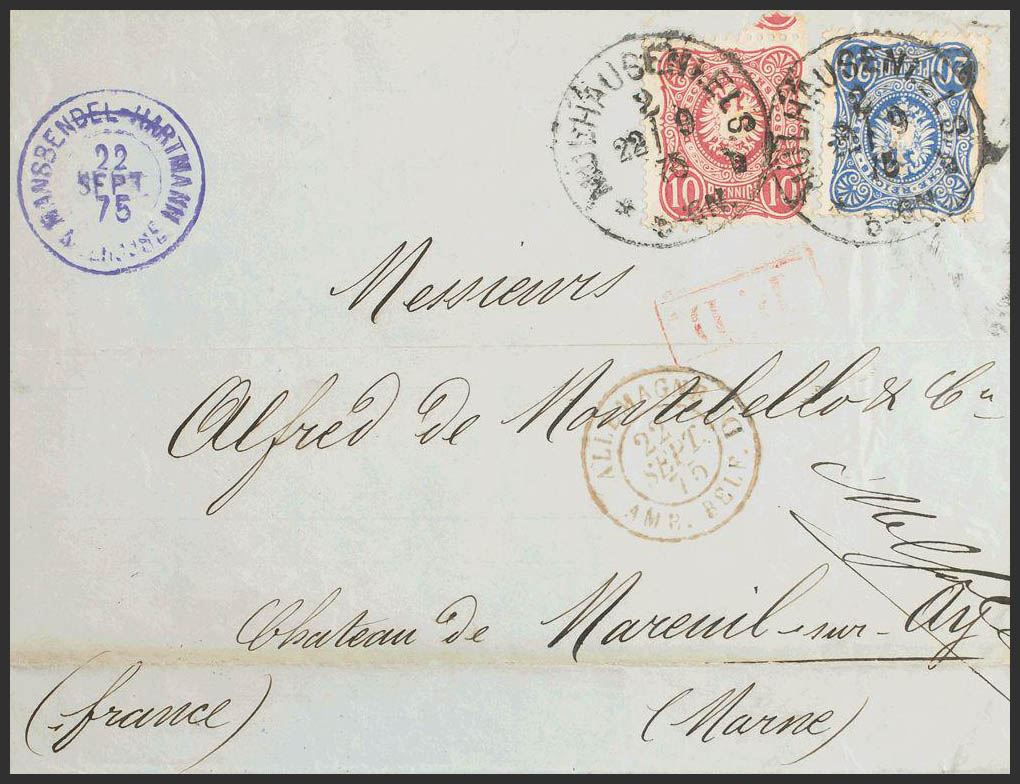 Yvert 32, 33. 1875. 10 p rosa y 20 p azul. MULHOUSE a MAREUIL SUR AY (FRANCIA). En el frente fechador MANSBENDEL-HARTMANN / MULHOUSE, en violeta. MAGNIFICO.