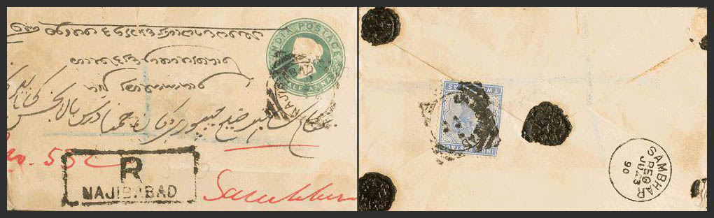 Yvert 37. 1890. 1/2 a verde sobre Entero Postal Certificado de MAJIBABAD a SAMBHAR, con franqueo complementario de 2 a ultramar. MAGNIFICA.