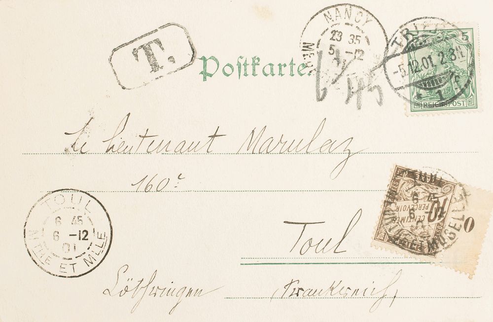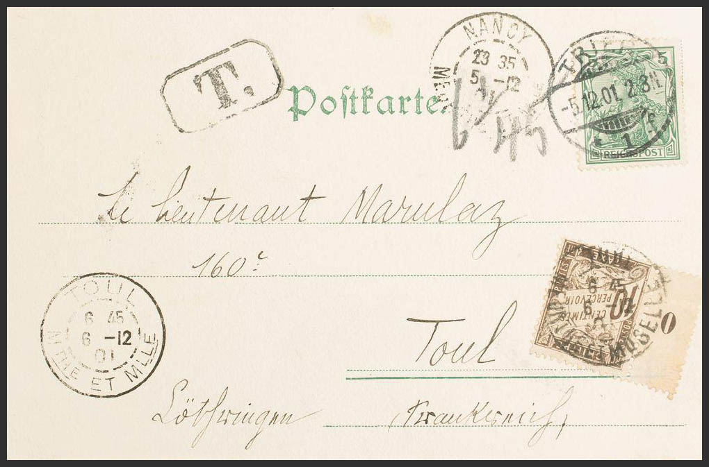 Yvert 53. 1901. 5 p verde. Tarjeta Postal de TRIER a NANCY (FRANCIA). Tasada a la llegada con sello de 10 cts castaño, de Tasas de Francia. MAGNIFICA.