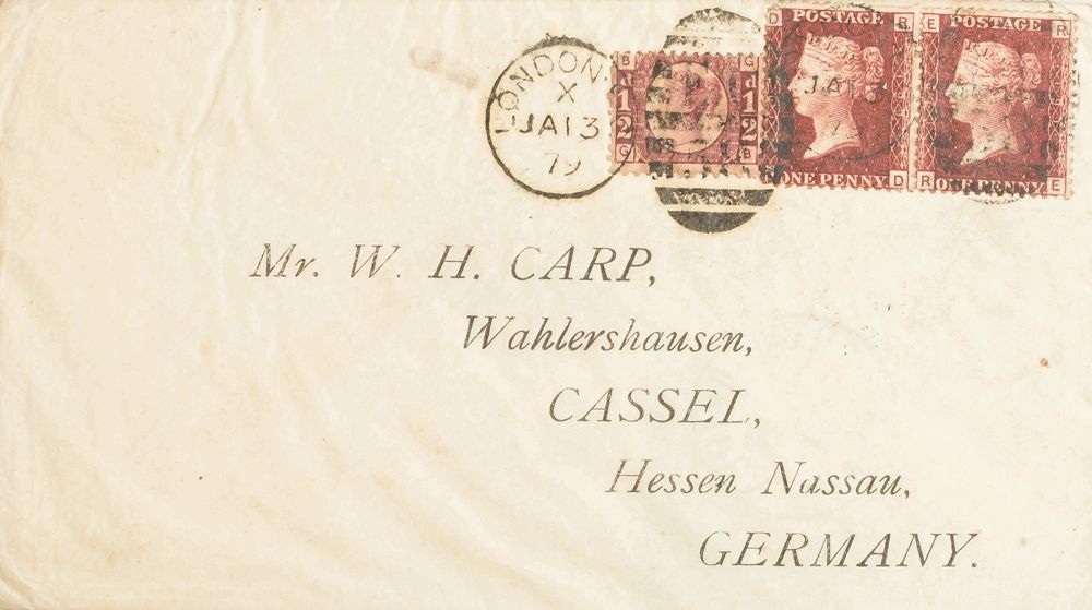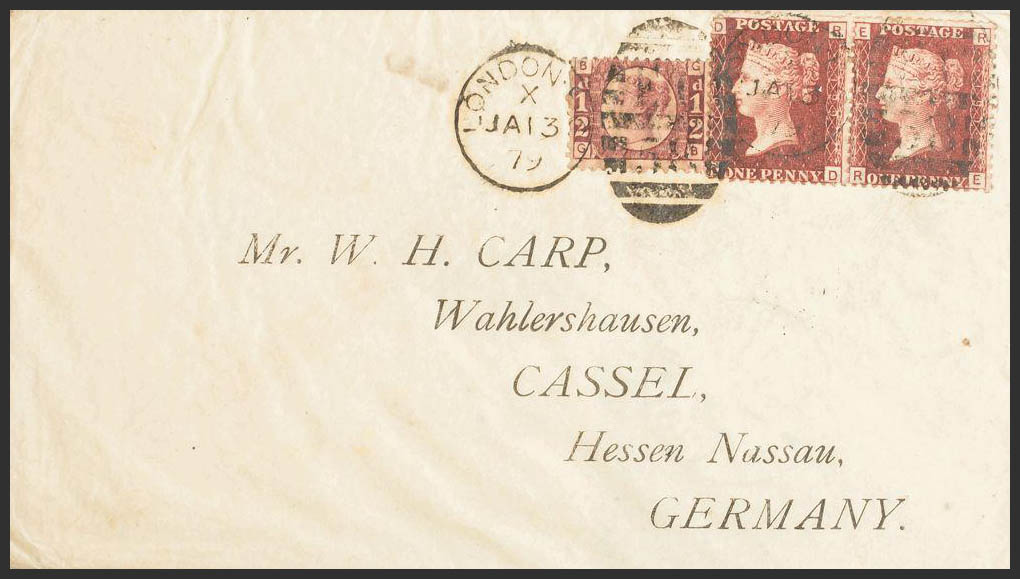 Yvert 26(2), 49. 1879. 1 p rojo carmÃn Plancha 199, dos sellos y 1/2 p rojo carmÃn. LONDRES a CASSEL (ALEMANIA). MAGNIFICA.
