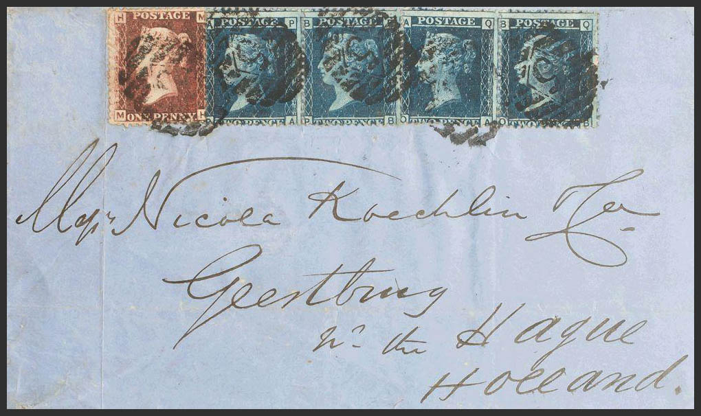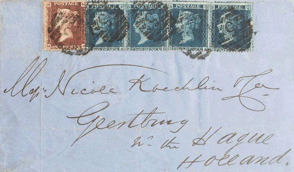 Yvert 10, 11(4). 1867. 1 p rojo carmín y 2 p azul, tira de cuatro. LONDRES a LA HAYA (HOLANDA). MAGNIFICA.