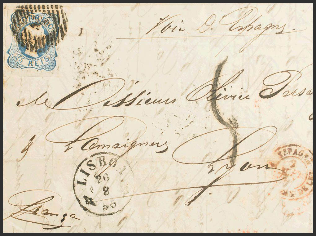 Yvert 6. 1855. 25 reis azul. LISBOA a LYON (FRANCIA). Matasello NUMERAL Nº1, en el frente ambulante francés y "4" manuscrito por circular fuera de tarifa. MAGNIFICA Y RARA.