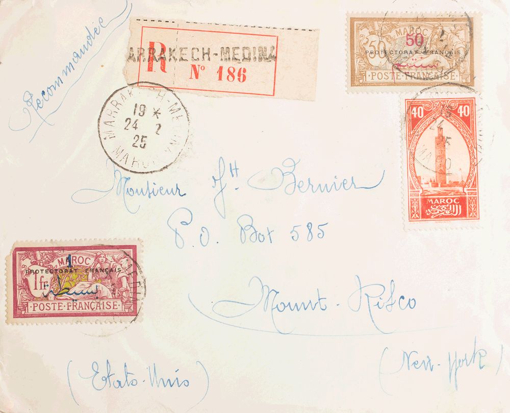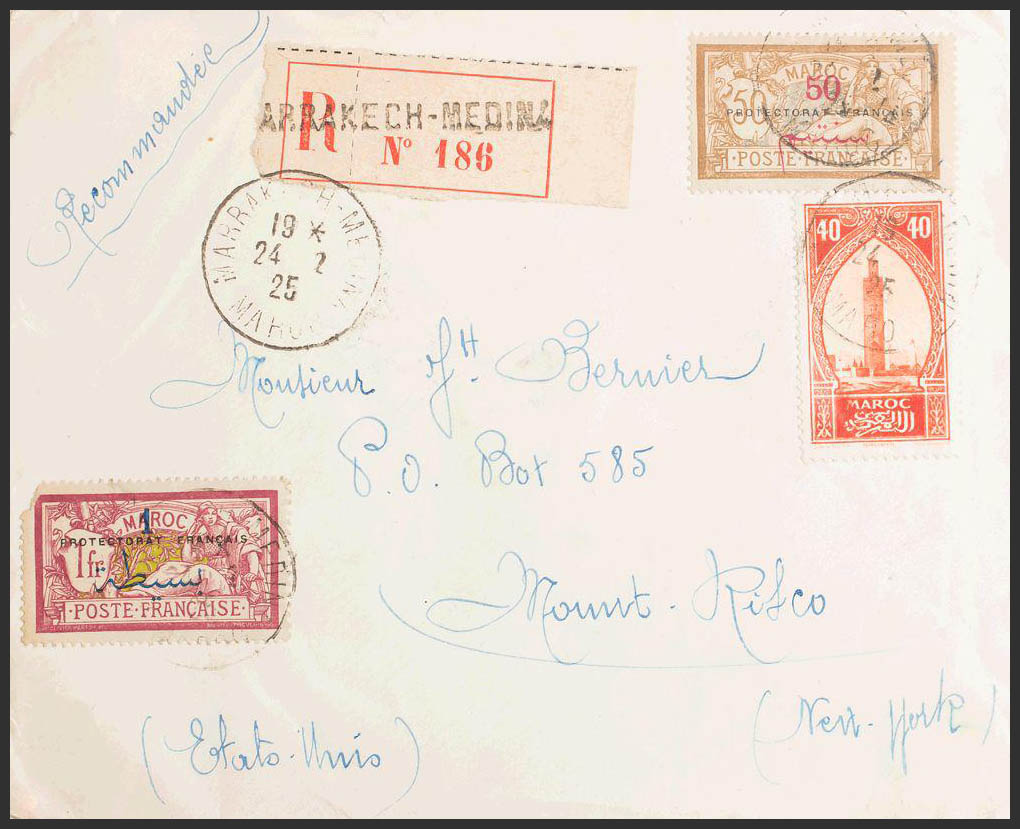 Yvert 50, 51, 110. 1925. 50 cts sobre 50 cts castaño, 1 p sobre 1 fr carmÃn (defecto) y 40 cts naranja. Certificado de MARRAKECH a MOUNT KISCO (USA). Al dorso llegada. MAGNIFICA.
