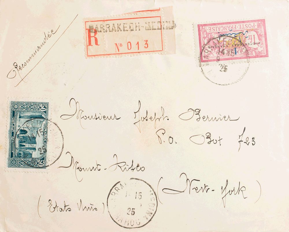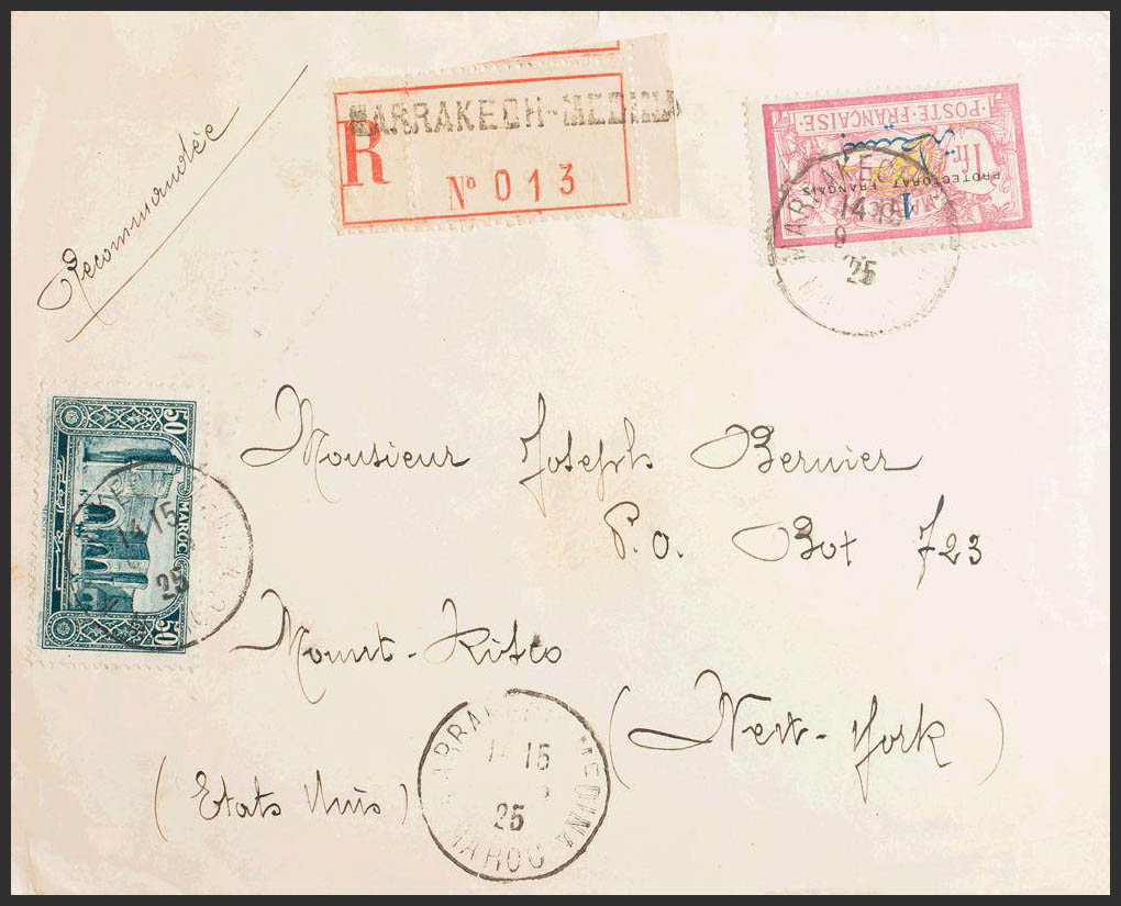 Yvert 51, 112. 1925. 1 p sobre 1 fr carmÃn y 50 cts azul verde. Certificado de MARRAKECH a MOUNT KISCO (USA). Al dorso llegada. MAGNIFICA.