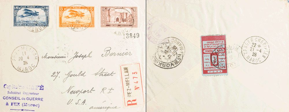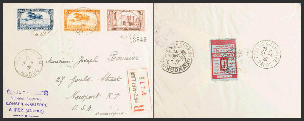 Yvert 117, Aéreo 1, 9. 1928. 1´05 fr castaño y Correo Aéreo 5 cts naranja y 1´90 fr azul. Certificado de FEZ a NEWPORT (USA). Al dorso viñeta del R. E. C. P. REGISTRE D´ECHANGISTES DE CARTES POSTALES y llegada. MAGNIFICA.