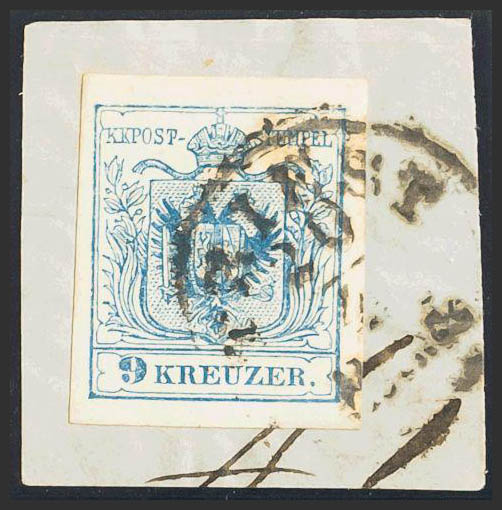 △Yvert 5. 1850. 9 k azul, sobre fragmento. Matasello TRIEST. PIEZA DE LUJO.
