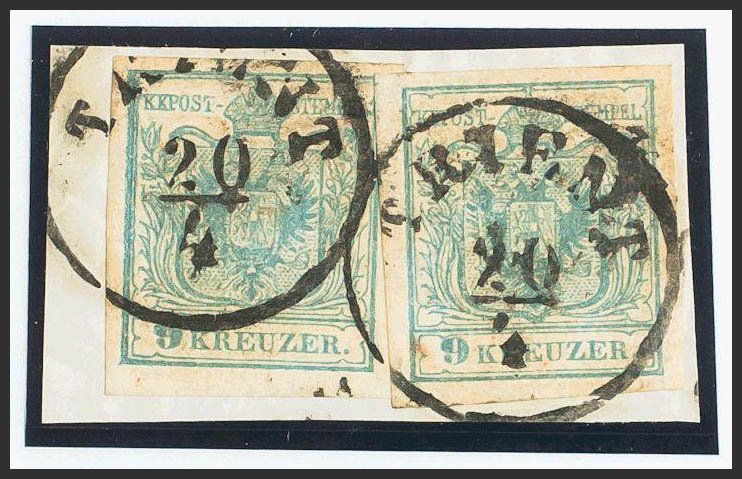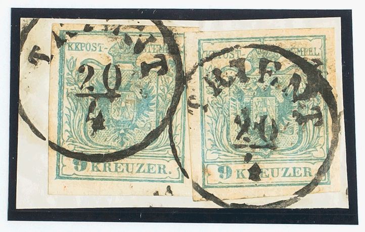 △Yvert 5(2). 1850. 9 k azul, dos sellos, sobre fragmento. MAGNIFICA.