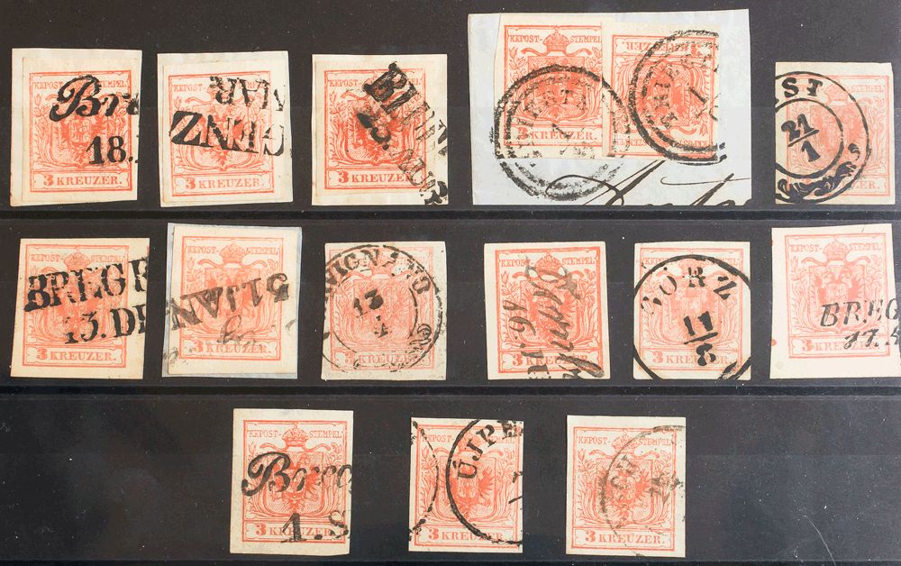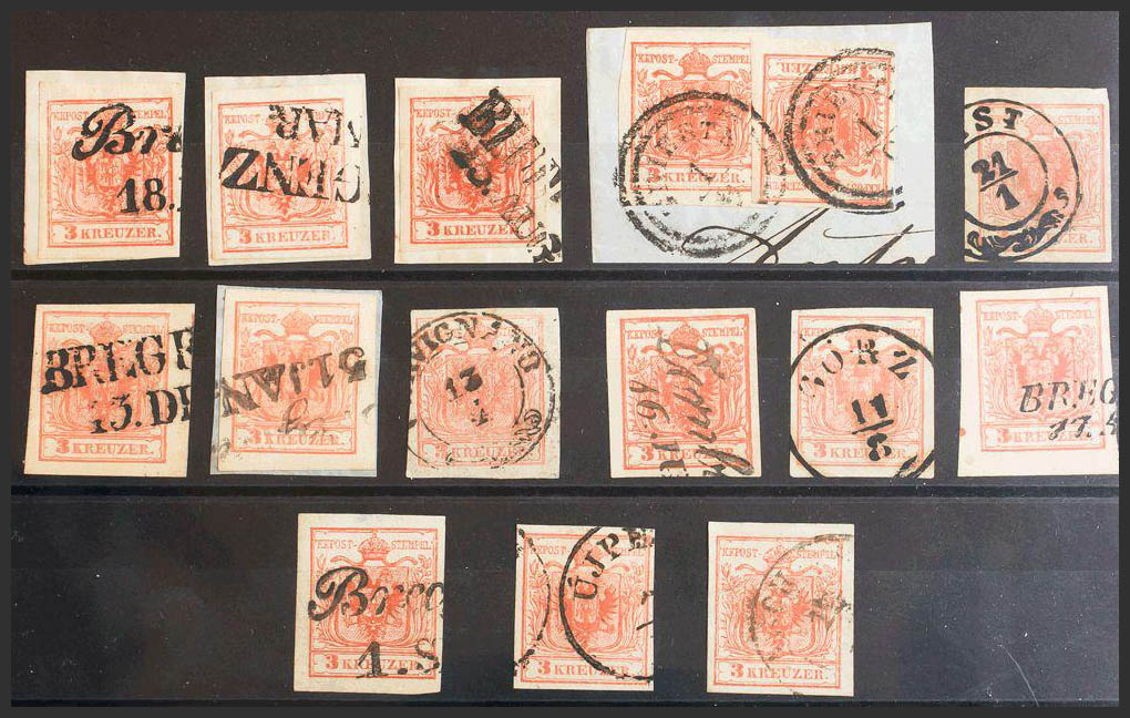 Yvert 3(15). 1850. Conjunto de trece sellos y dos sellos sobre fragmento del 3 k naranja, alguno de ellos sobre fragmento y todos ellos con matasellos muy espectaculares. MAGNIFICO.