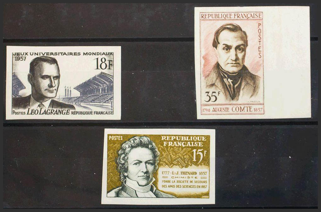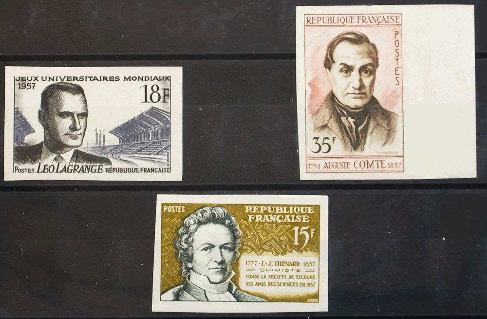 ★Yvert 1120a, 1121a, 1139a. 1957. 18 fr negro, 35 fr castaño rojo y 15 fr oliva y verde. SIN DENTAR. MAGNIFICOS. Yvert 2014: 89 Euros
