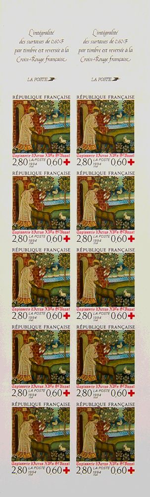 ★★Yvert 2915b. 1994. 2,80 fr + 60 cts multicolor, diez sellos en banda de carnet. SIN DENTAR. MAGNIFICA Y RARA. Yvert 2014: 400 Euros