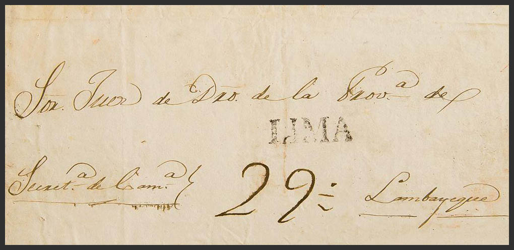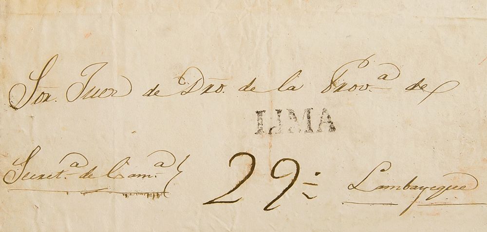 (1836ca). Frente de Plica Judicial de LIMA a LAMBAYEQUE. Marca LIMA, en negro (Colareta 14) y porteo "22" manuscrito. MAGNIFICA.
