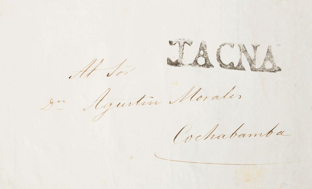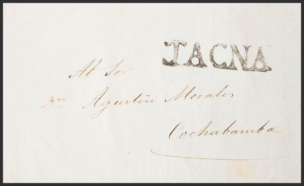 1846. LONDRES a COCHABAMBA. Marca TACNA, en negro, aplicada en tránsito. MAGNIFICA Y RARA, NO CATALOGADA EN LA OBRA DE COLARETA.