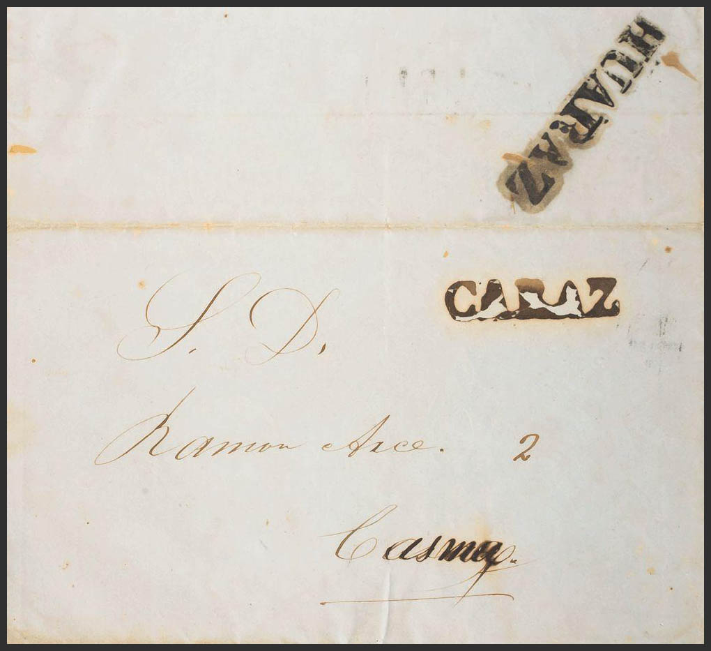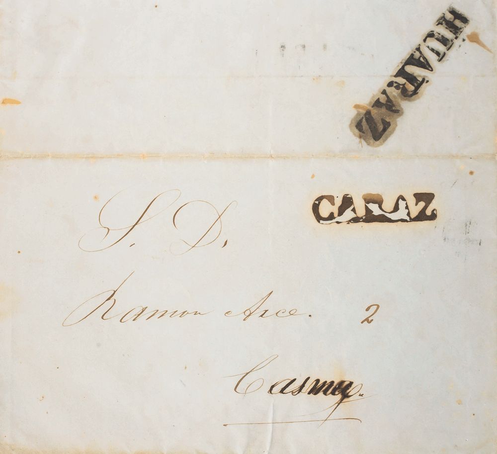 (1847ca). CARAZ a CASMA. Marca CARAZ (tinta erosionada), en negro (Colareta 1), al dorso marca HUARAZ, aplicada en tránsito. MAGNIFICA.