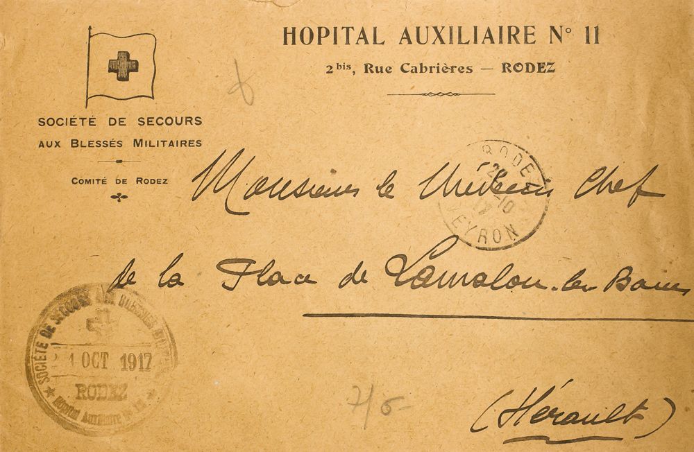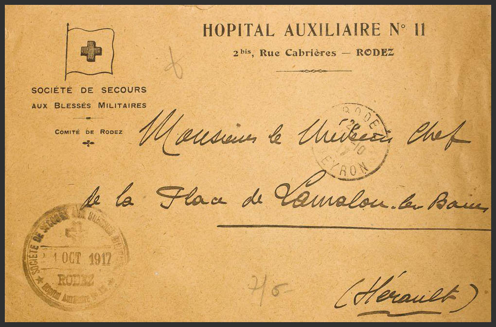 1917. Carta con membrete de la SOCIETE DE SECOURS AUX BLESES MILITAIRES. RODEZ a LAMALOU LES BAINS. Marca SOCIETE DE SECOURS AUX BLESES MILITAIRES / RODEZ / HOPITAL AUXILIAIRE Nº11. MAGNIFICA.