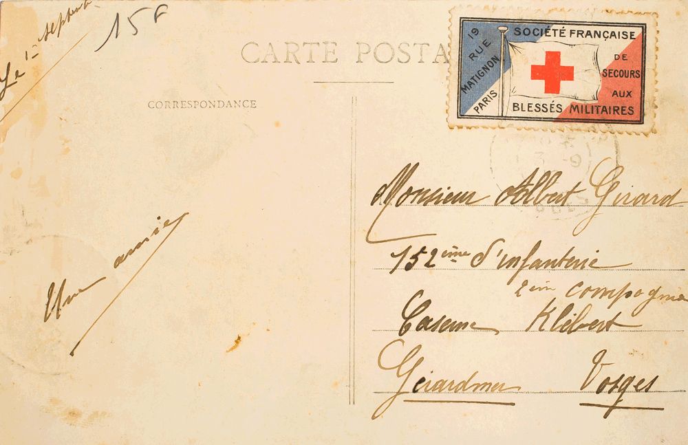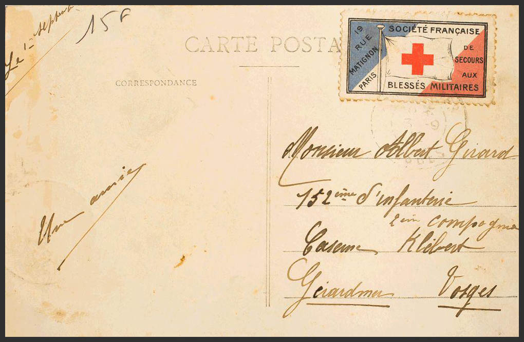 Yvert 137. 1912. 5 cts verde (al dorso con defecto) y viñeta de la SOCIETE FRANCAISE DE SECOURS AUX BLESES MILITAIRES. Tarjeta Postal dirigida a GERARDMER. En el frente llegada. BONITA.