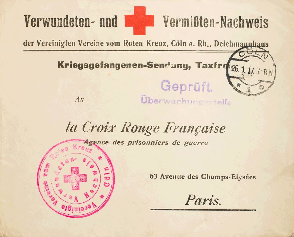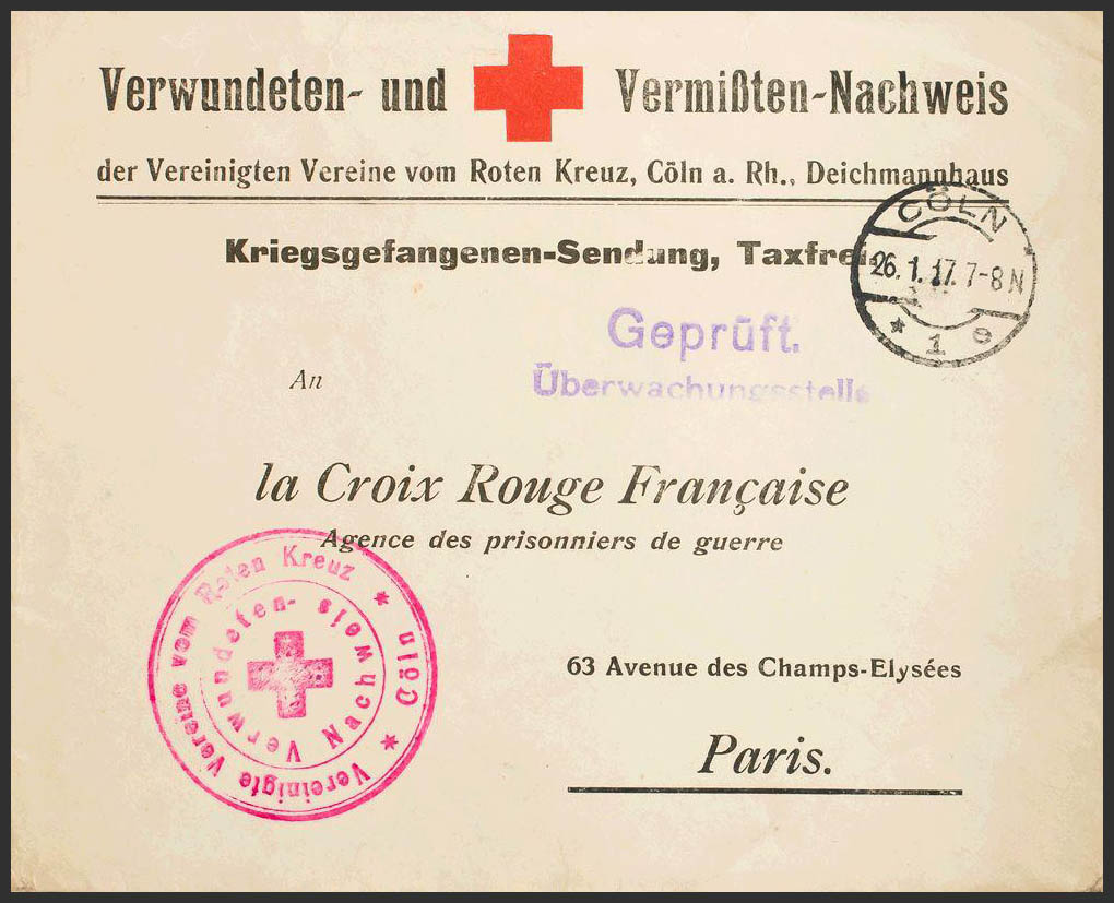 1917. Sobre Preimpreso de la Cruz roja (heridos y desaparecidos) de COLONIA a PARIS, correspondencia de Prisioneros de Guerra. En el frente marca VEREINING TE VEREINTE VOM ROTEN KREUTZ / *CÖLN*, en carmín. MAGNIFICA Y RARA.