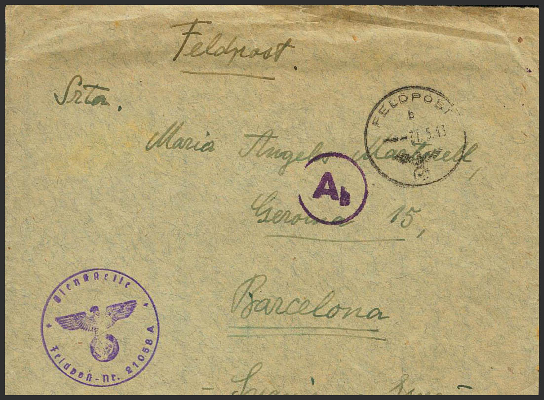 1943. Feldpost 21058-C (Correo Alemán) a BARCELONA. Marca FELDPOST-NR-21058A, en violeta y fechador FELDPOS / P, en negro (correspondiente a la Unidad de Artillería Nº633, colmna de Baterías 1 a 3). MAGNIFICA.