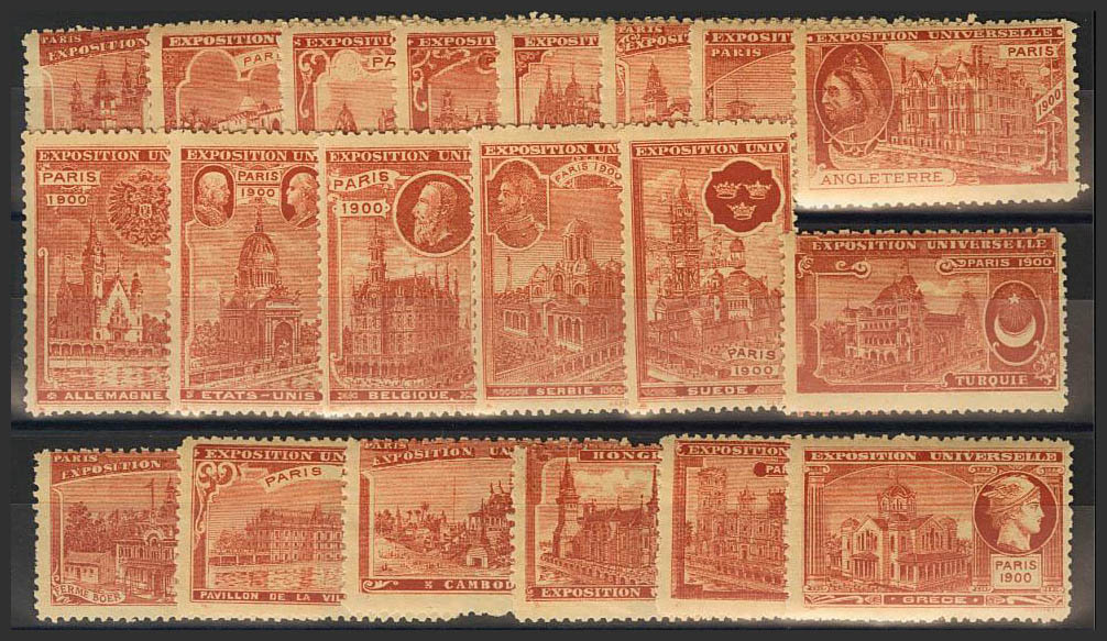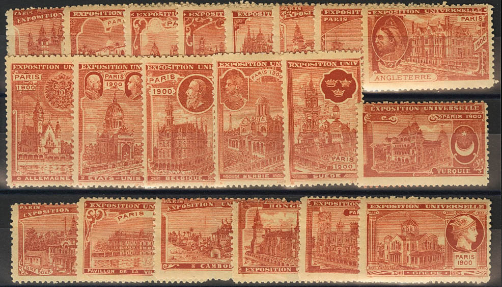 ★★/★1900. Interesante conjunto de veinte viñetas en color castaño rojo con la reproducción de los monumentos más importantes de cada país participante en la Exposición Universal de 1911, en París. MAGNIFICO Y RARO.