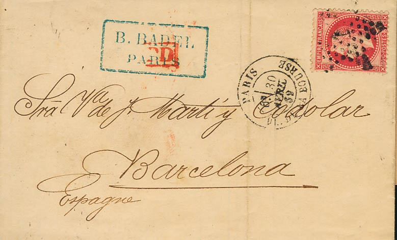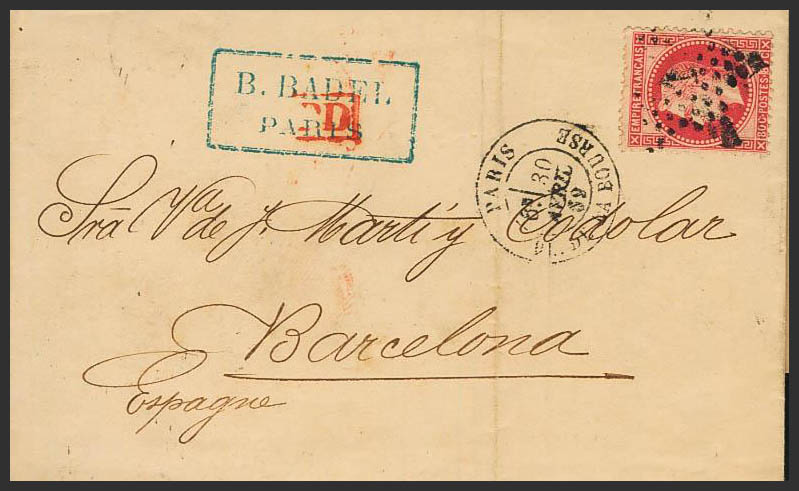 Yvert 32. 1867. 80 cts rosa. PARIS a BARCELONA. Matasello ESTRELLA Nº1, tarifa de doble porte a España. MAGNIFICA.