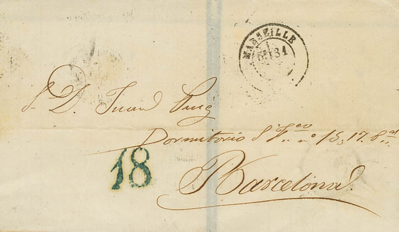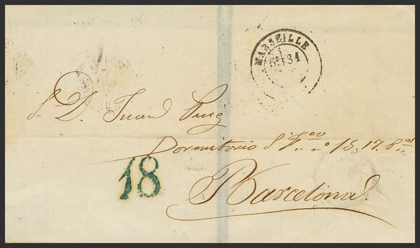 1871. MARSELLA a BARCELONA. Tasada a la llegada con "18" cuartos. MAGNIFICA.