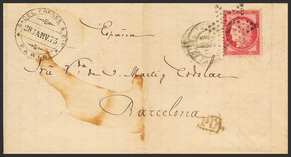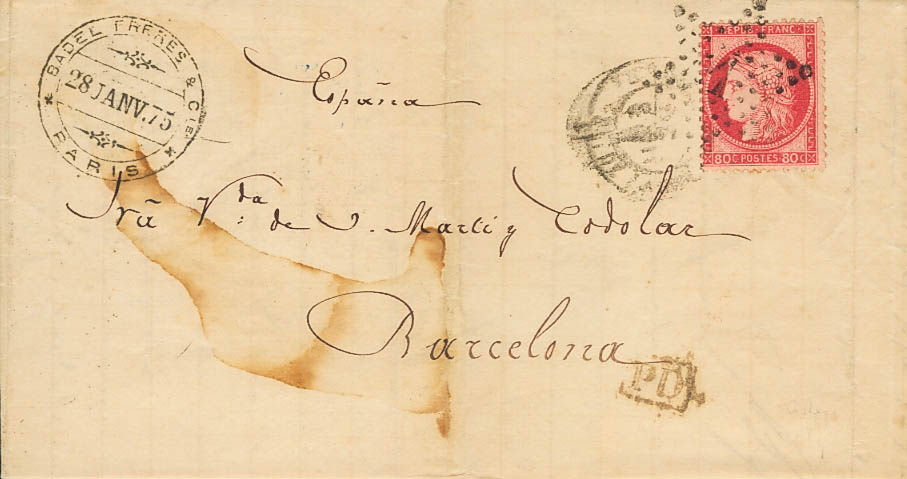 Yvert 57. 1875. 80 cts rosa. PARIS a BARCELONA. MAGNIFICA.