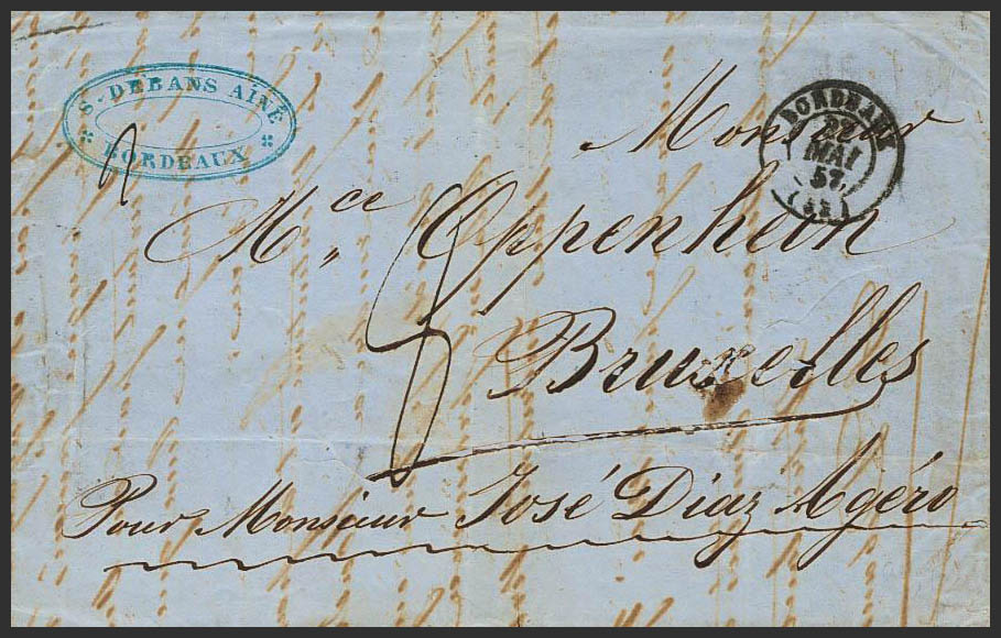 1857. BURDEOS a BRUSELAS. Porteo manuscrito de "8 décimas", al dorso ambulantes diversos y llegada. MAGNIFICA.