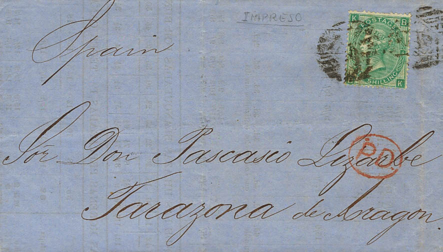 Yvert 31. 1865. 1 sh verde Plancha 4. Impreso de LONDRES a TARAZONA (ESPAÑA, ARAGON), circulado por vÃa terrestre. MAGNIFICA.