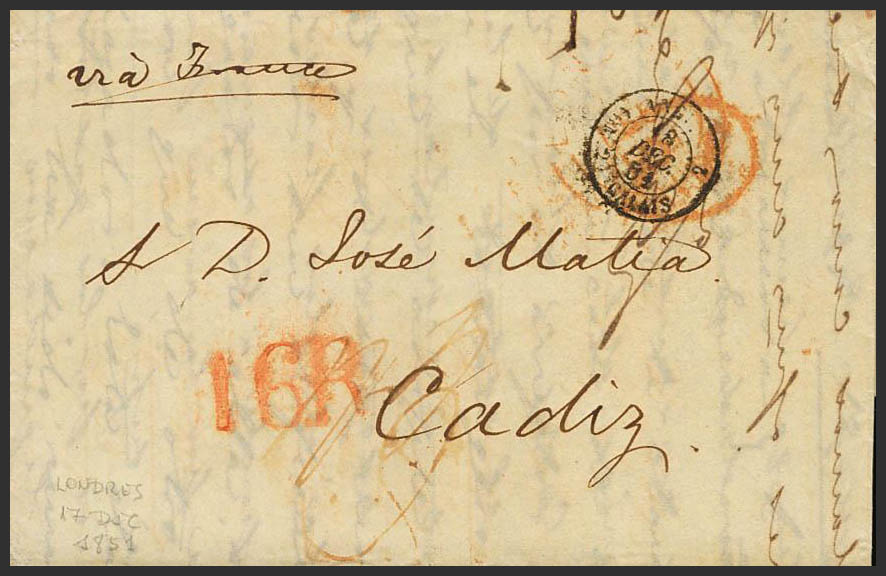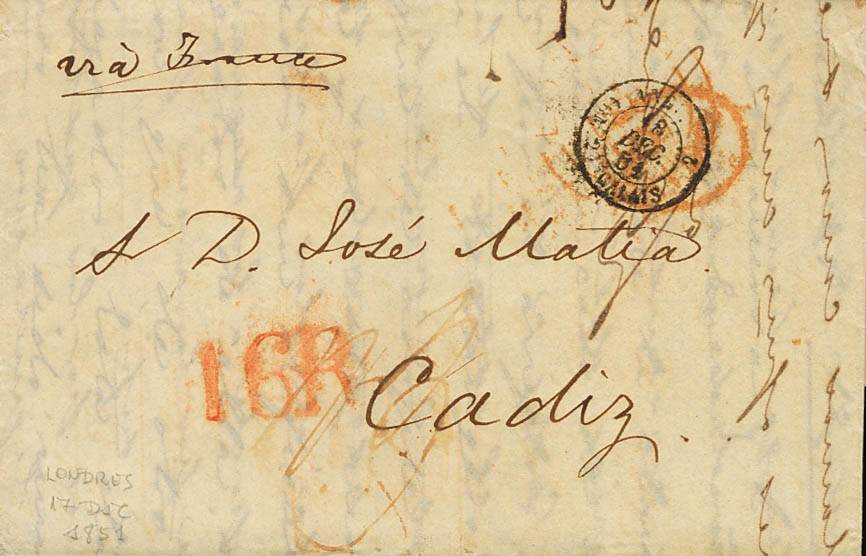 1857. LONDRES a CADIZ (circulada vía Francia). Porte manuscrito 1/3 (prepagado) y "16 R" (reales) aplicado en España. MAGNIFICA.