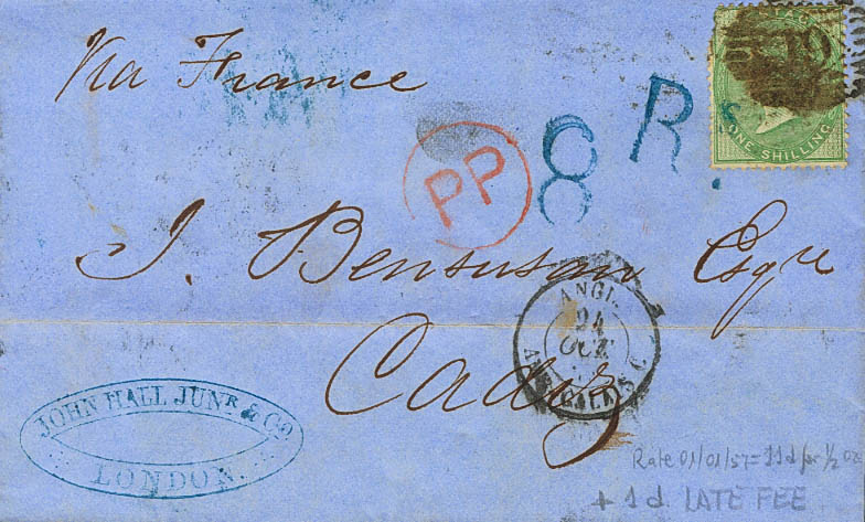 Yvert 20. 1857. 1 sh verde (pequeño defecto en la esquina superior izquierda). LONDRES a CADIZ, circulada vía Francia. Tasada a la llegada con "8 R" (reales), al dorso fechadores de tránsito y llegada y marca M.P., en azul. BONITA.