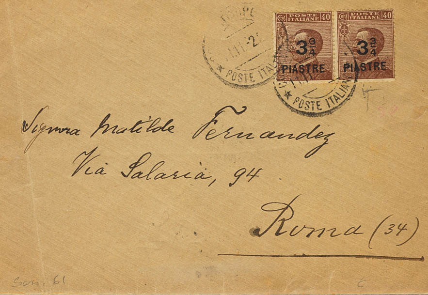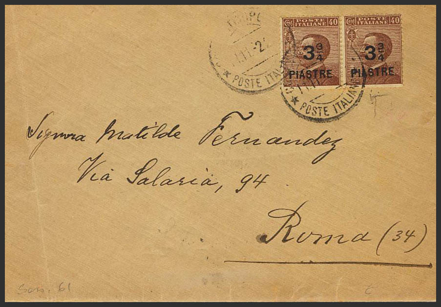157(2). 1922. 3 3/4 piastre sobre 40 cts castaño, pareja. CONSTANTINOPLA (TURQUIA) a ROMA. Matasello CONSTANTINOPOLI / *POSTE ITALIANE*. MAGNIFICA. (Sassone 61)