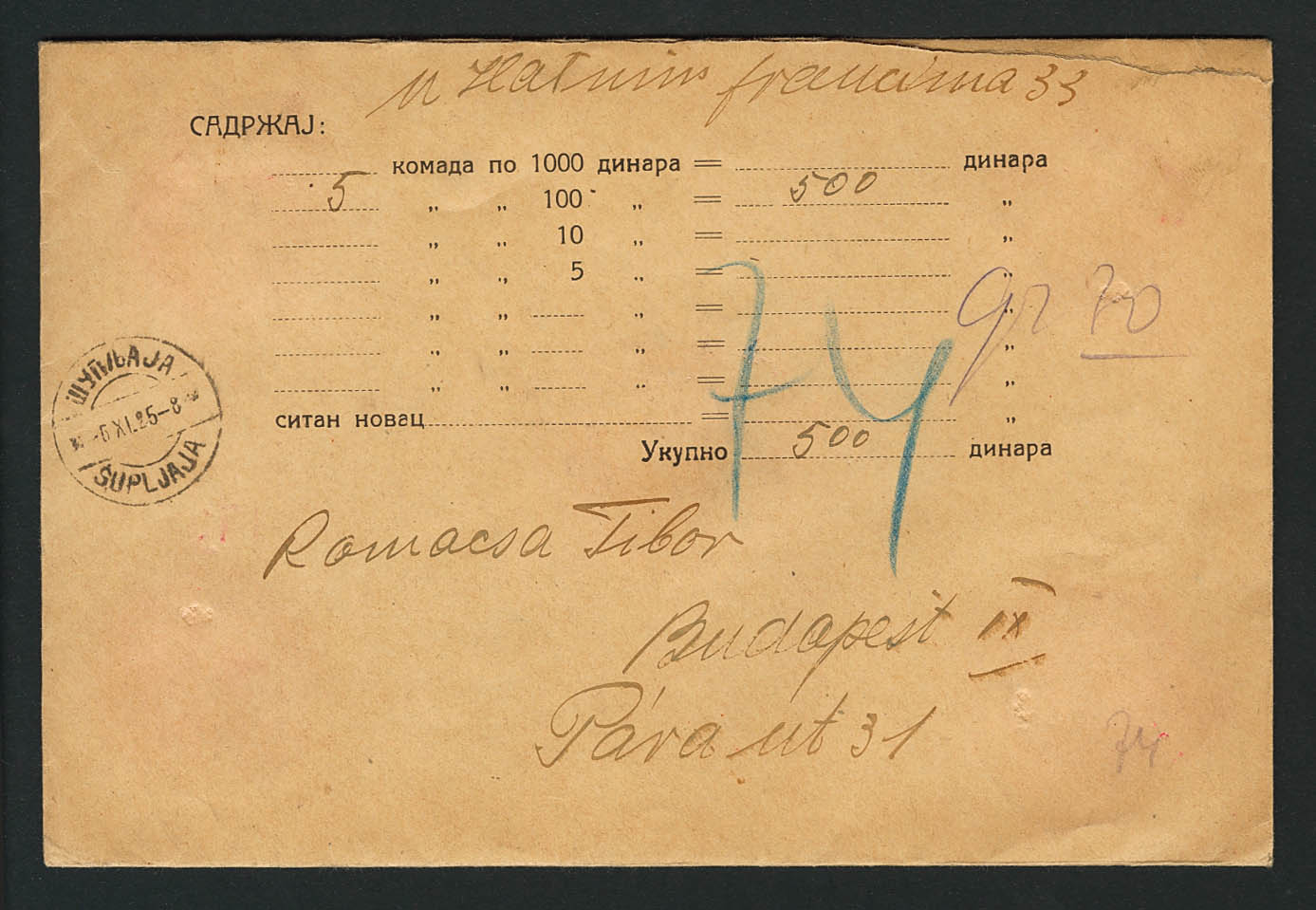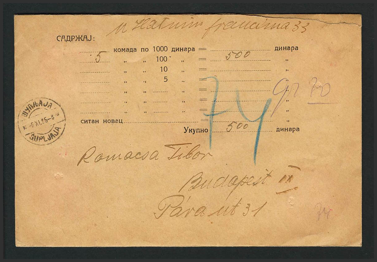 Yvert 152, 159, 162. 1925. 8 d violeta, 50 p sepia y 3 d ultramar (franqueados al dorso). Valor Declarado de SUPLJAJA (actual Krajisnik) a BUDAPEST. Al dorso llegada. MAGNIFICA.