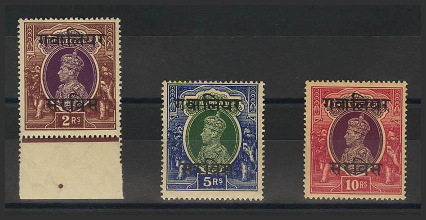 ★★Yvert 48/50. 1938. 2 r castaño y violeta, 5 r azul violeta y verde y 10 r rojo y violeta (valores clave). MAGNIFICA. (SGO92/94 128£) Yvert 2010: 168 Euros