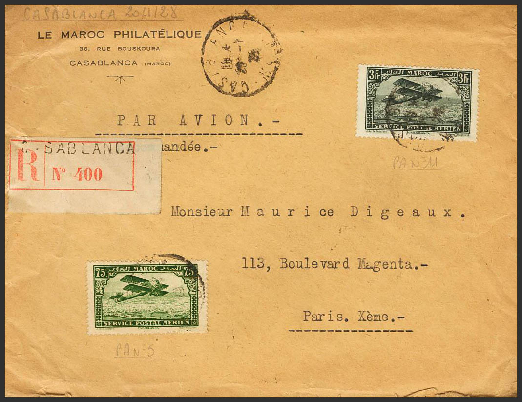 Yvert 5, 11. 1926. 75 cts verde y 3 fr negro. Certificado de CASABLANCA a PARIS (FRANCIA). Al dorso llegada. MAGNIFICA.