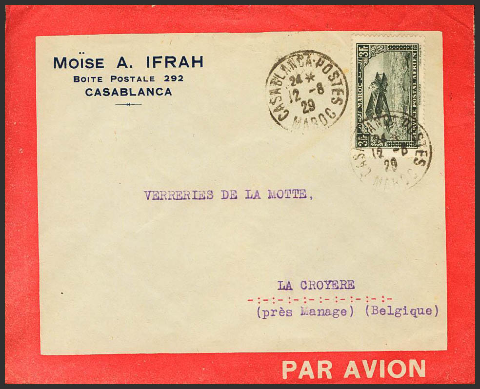 Yvert 11. 1929. 3 fr negro. Correo Aéreo de CASABLANCA a LA CROYERE (BELGICA). MAGNIFICA.