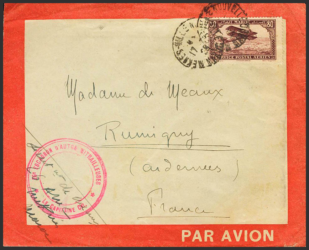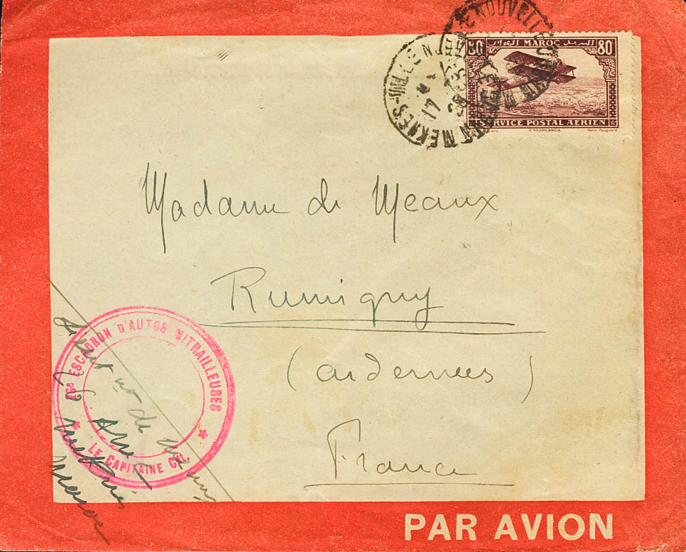 Yvert 6. 1928. 80 cts castaño lila. MEKNES a RUMIGNY (FRANCIA). En el frente marca de franquicia 26º ESCADRON D´AUTOS MITRAILLEURS / *LE CAPITAINE CMT*, en carmín y al dorso llegada. MAGNIFICA.