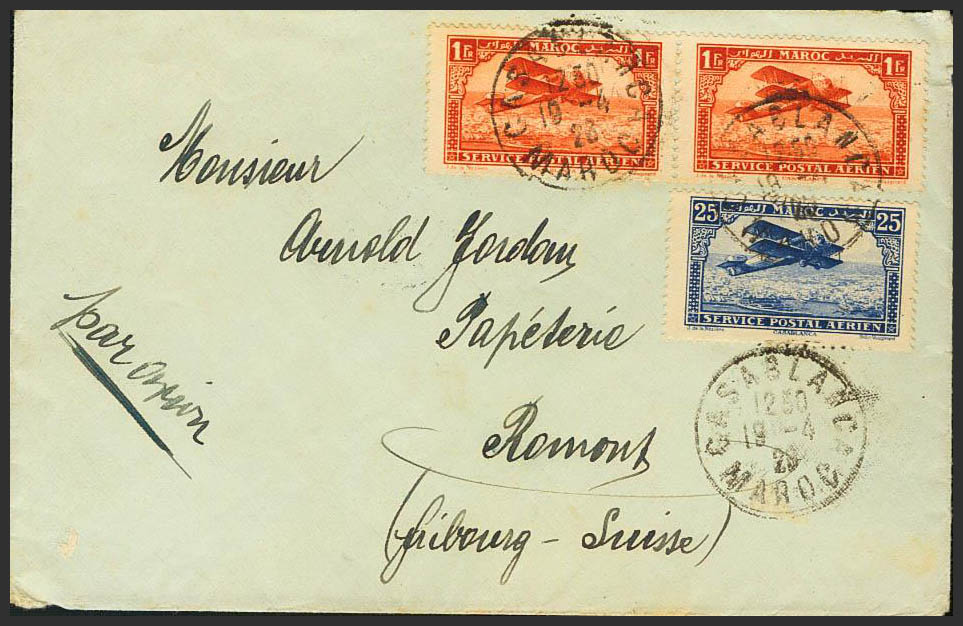 Yvert 2, 7a(2). 1928. 25 cts azul y 1 fr naranja (Tipo III), dos sellos. Correo Aéreo de CASABLANCA a ROMONT (SUIZA). Al dorso llegada. MAGNIFICA.