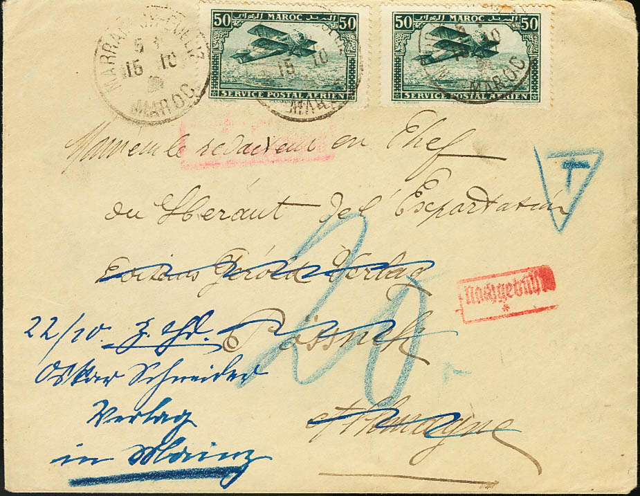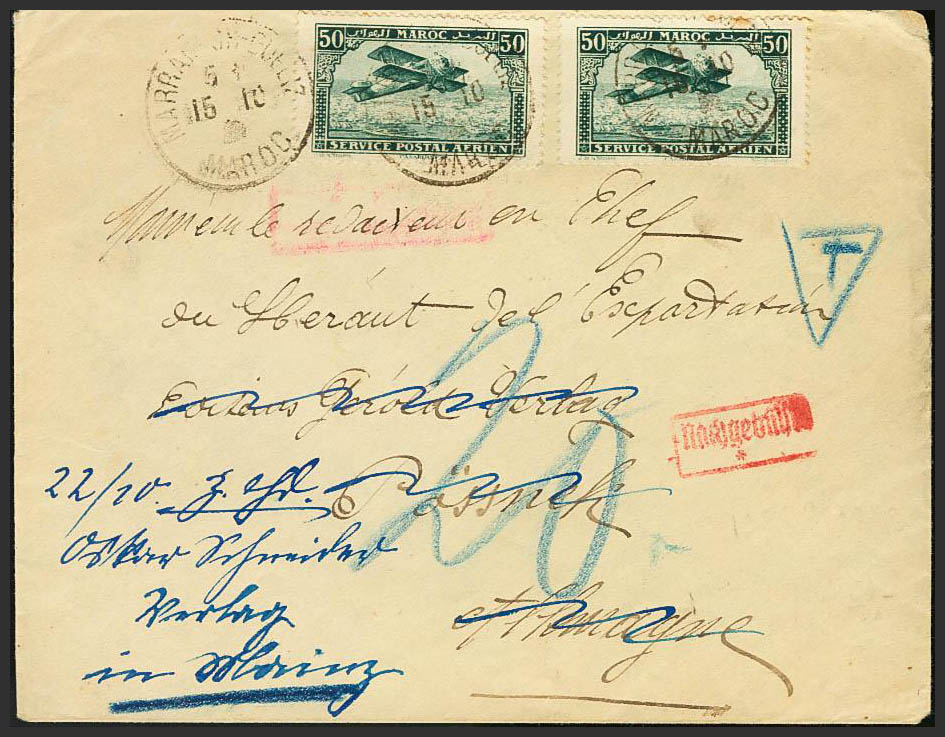 Yvert 3(2). 1928. 50 cts azul verde, dos sellos. MARRAKECH a POSSNECK (ALEMANIA), reexpedida a HARBURG. Tasa manuscrita "20" para cubrir la reexpedición. MAGNIFICA.